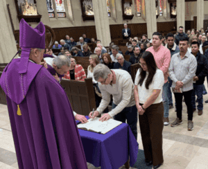 The Rite of Election includes the official enrollment of names of all those seeking Baptism at the Easter Vigil. At this Rite the catechumens publicly request Baptism and declare their desire to make a faith commitment to live as disciples of Jesus Christ in the Catholic Church.